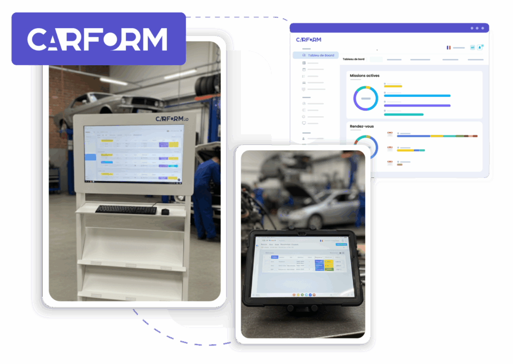 Tous nos équipements sont préconfigurés avec l’interface Carform, robustes et prêts à l’emploi, avec connexion Wi‑Fi (et Ethernet pour la borne), accessoires inclus et paramétrage selon vos profils. Livraison, mise en service et accompagnement par nos équipes.